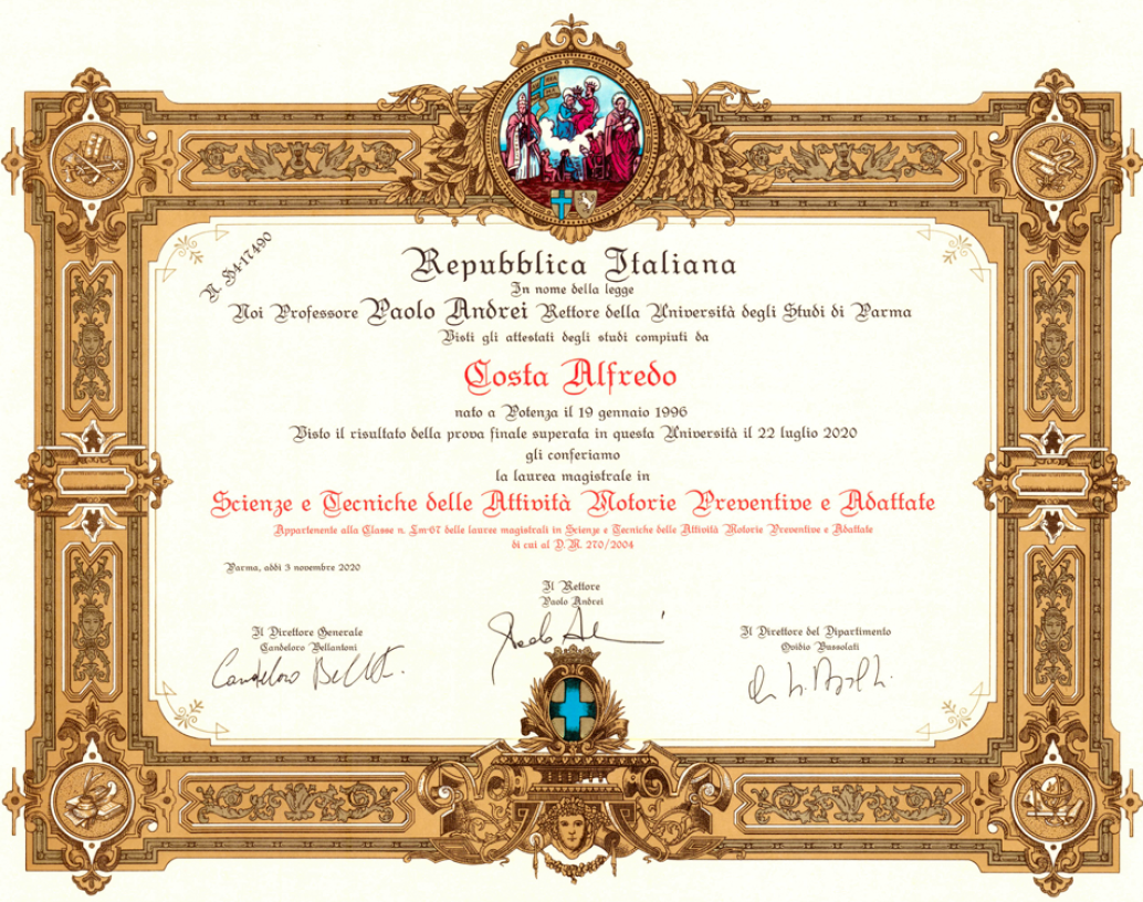 Scienze e Tecniche delle Attività Motorie Preventive e Adattate, conseguita presso l'Università degli Studi di Parma