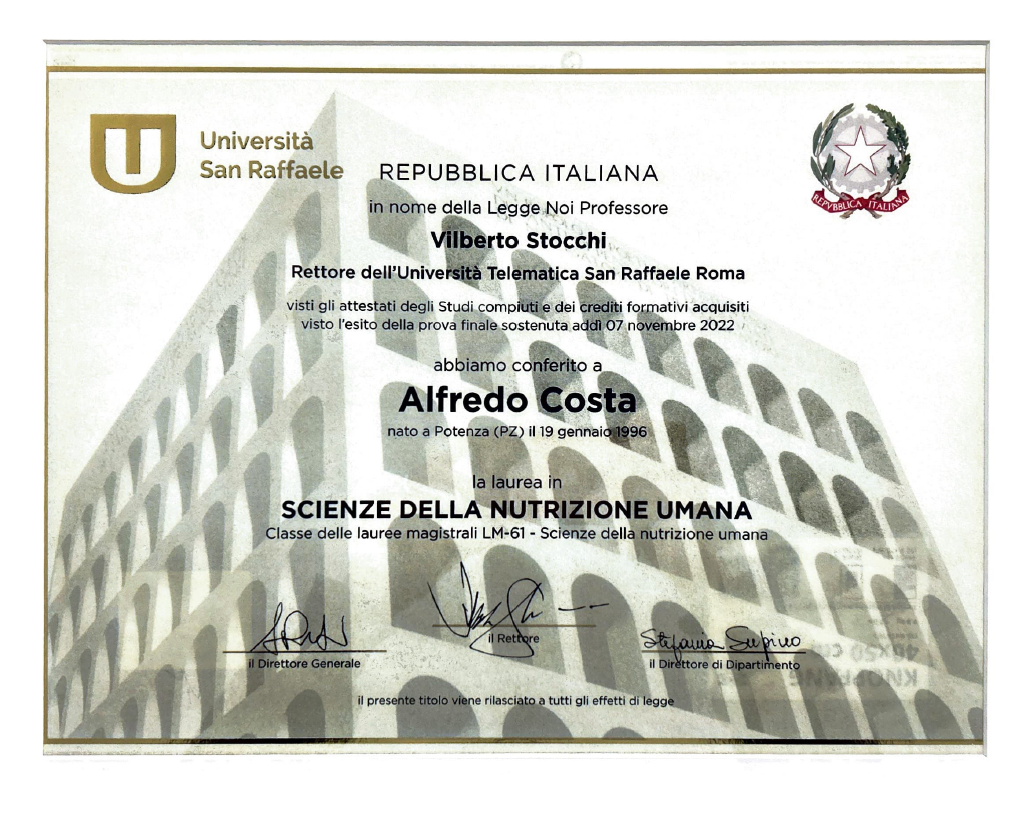 Scienze della Nutrizione Umana, conseguita presso l'Università San Raffaele di Roma